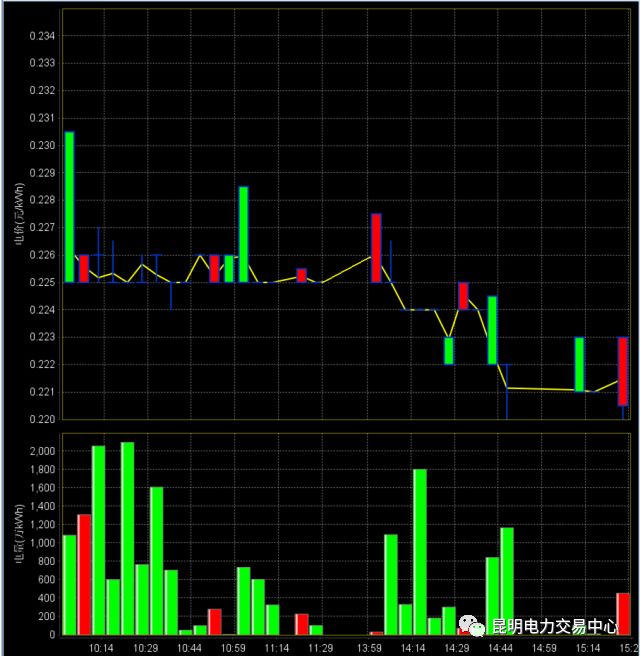 連續(xù)掛牌兩個階段(集合競價和連續(xù)掛牌)共成交電量24927.7萬千瓦時,平均成交價0.22452元/千瓦時,最高成交價0.2595元/千瓦時,最低成交價0.22元/千瓦時。