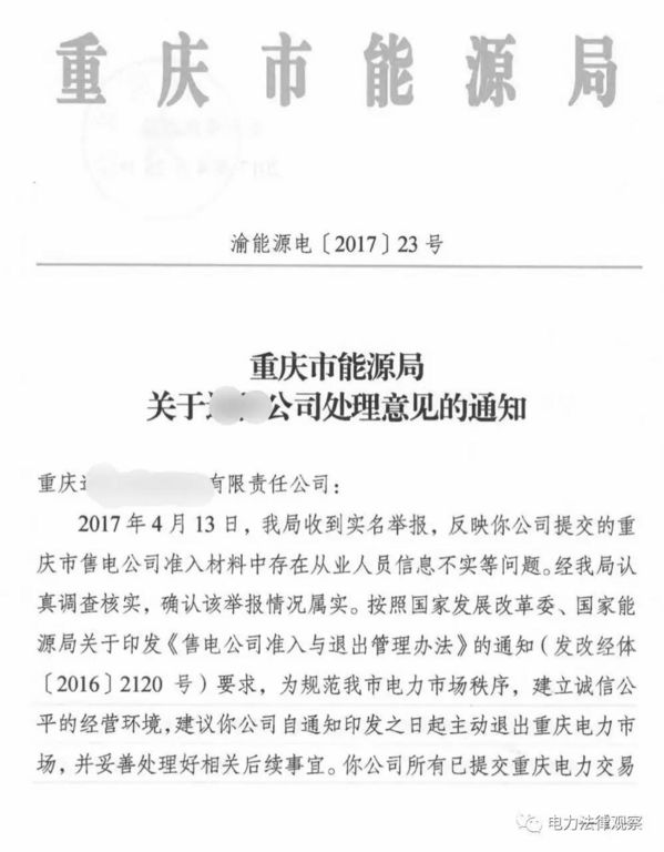 更需要引起小伙伴們注意的是該售電公司被驅(qū)逐的過程和原因:該公司遭到實(shí)名舉報,反映該公司“提交的重慶市售電公司準(zhǔn)入材料中存在從業(yè)人員信息不實(shí)等問題”,能源局調(diào)查“確認(rèn)該舉報情況屬實(shí)”,故而依據(jù)有關(guān)文件做出處理。