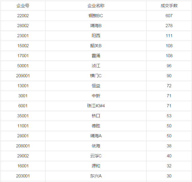 供應(yīng)方: 共51家參與,29家成交。參與掛牌36家, 掛牌2052手,掛牌電量205200 萬千瓦時, 掛牌成交11家,成交283手,成交電量 28300 萬千瓦時。參與摘牌29家, 摘牌成交23家,成交1797手,成交電量 179700 萬千瓦時。