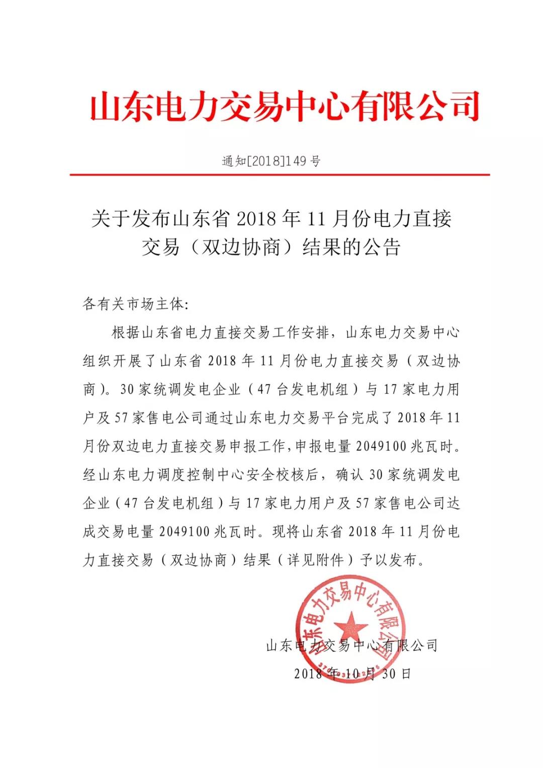 關(guān)于發(fā)布山東省2018年11月份電力直接交易(雙邊協(xié)商)結(jié)果的公告