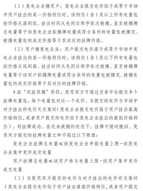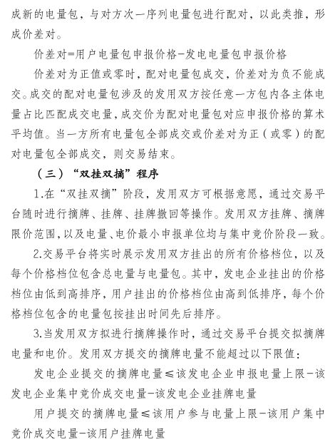 本次交易采用復式競價撮合交易方式,按水電交易執(zhí)行。交易過程分為“集中競價、雙掛雙摘”兩個階段,其中前30分鐘為集中競價階段,其余時段為雙掛雙摘階段。
