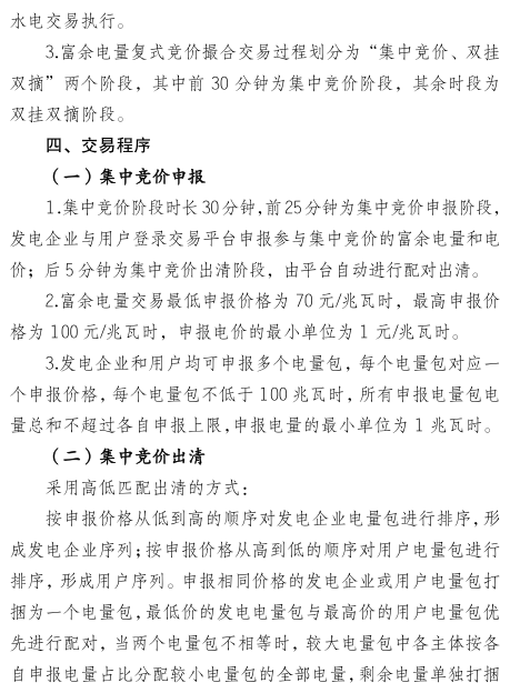 富余電量交易最低申報價格為0.07元/千瓦時,最高申報價格為0.10元/千瓦時,申報電價的最小單位為0.001元/千瓦時。