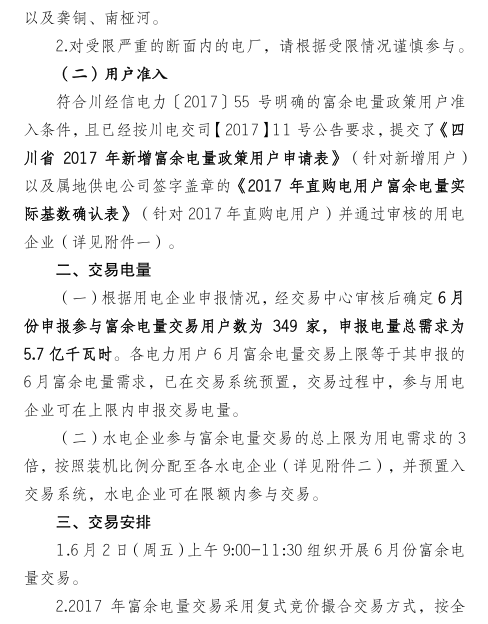 近日,四川電力交易中心發(fā)布了《關于開展2017年6月富余電量交易的公告》,將于今日(6月2日)開展6月份富余電量交易。