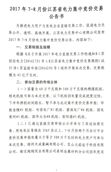 2017年7-8月份江蘇省電力集中競價(jià)交易公告