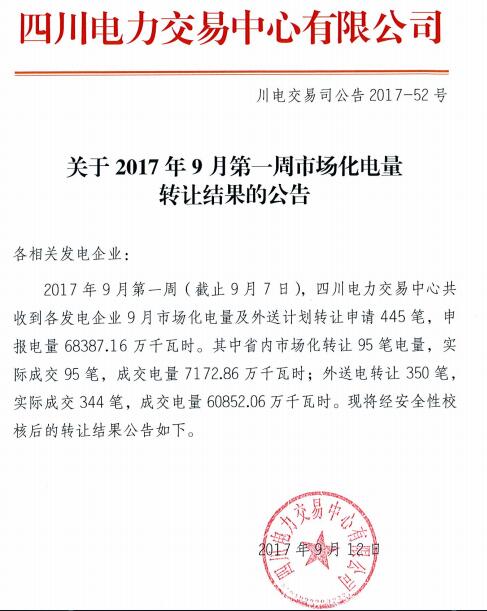 附件:關(guān)于2017年9月第一周市場化電量轉(zhuǎn)讓結(jié)果的公告