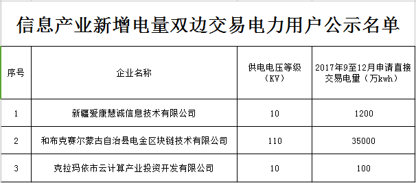 新疆自治區(qū)經(jīng)信委日前發(fā)布了《關(guān)于公示2017年信息產(chǎn)業(yè)新增電量雙邊交易電力用戶名單的通知》,通知中稱,自治區(qū)將組織2017年云計(jì)算、大數(shù)據(jù)等信息產(chǎn)業(yè)新增電量雙邊交易,交易時(shí)段:2017年9月1日-2017年12月31日,公示名單中包含3家企業(yè)。