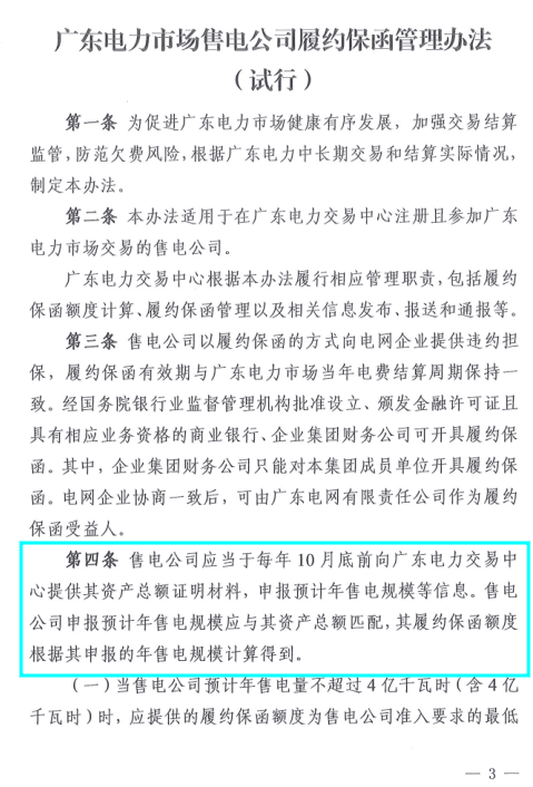 售電公司應當于每年10月底前向廣東電力交易中心提供其資產(chǎn)總額證明材料,申報預計售電規(guī)模等信息。