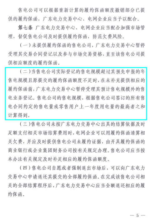 當售電公司實際登記的售電規(guī)模超過其預先申報的年售電規(guī)模且元提交的履約保函額度不足時,在未補充提供相應的履約保函前,廣東電力交易中心暫停受理其預計售電規(guī)模外的售電業(yè)務登記。