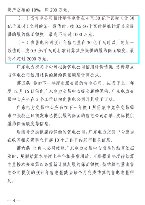 當售電公司預計年售電量在4至30億千瓦時(含30萬億千瓦時)之間的某一數(shù)值時,按0.5分/千瓦時標準計算其應提供的履約保函額度,最高不超過1000萬元。