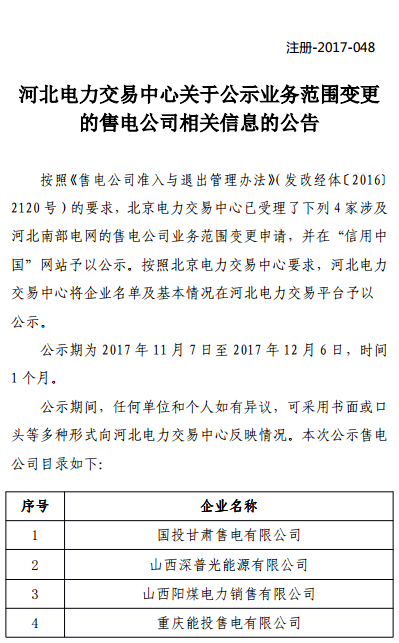 11月7日,河北電力交易中心發(fā)布了《關(guān)于公示業(yè)務(wù)范圍變更的售電公司相關(guān)信息的公告》,公告中稱,北京電力交易中心已受理了下列4家涉及河北南部電網(wǎng)的售電公司業(yè)務(wù)范圍變更申請(qǐng),將企業(yè)名單及基本情況在河北電力交易平臺(tái)予以公示。