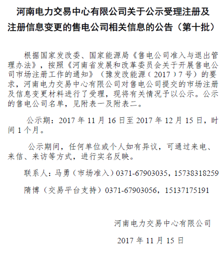 11月15日,河南電力交易中心發(fā)布了《關(guān)于公示受理注冊(cè)及注冊(cè)信息變更的售電公司相關(guān)信息的公告(第十批)》,公告稱(chēng),對(duì)17家售電公司提交的市場(chǎng)注冊(cè)及信息變更材料進(jìn)行了受理,公示期為11月16日至12月15日。