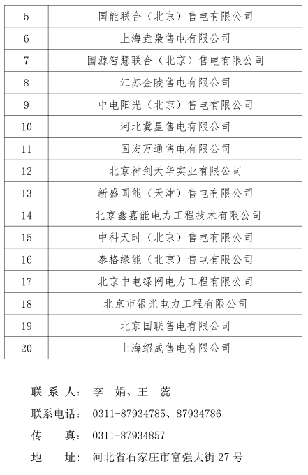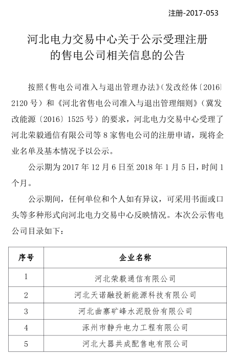 河北電力交易中心日前發(fā)布了關(guān)于受理注冊(cè)的售電公司相關(guān)信息的公告,河北電力交易中心受理了河北榮毅通信有限公司等8家售電公司的注冊(cè)申請(qǐng),另外還公示了北京電力交易中心推送的20家售電公司,詳情如下: