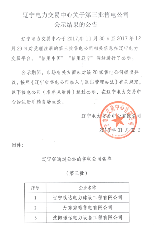 遼寧關(guān)于第三批售電公司公示結(jié)果的公告 新增20家售電公司