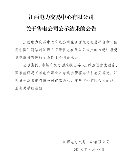 江西電力交易中心日前發(fā)布了關(guān)于售電公司公示結(jié)果的公告,公告中稱,江西電力交易中心對江西省恒源售電有限公司提交的市場注冊變更申請進行