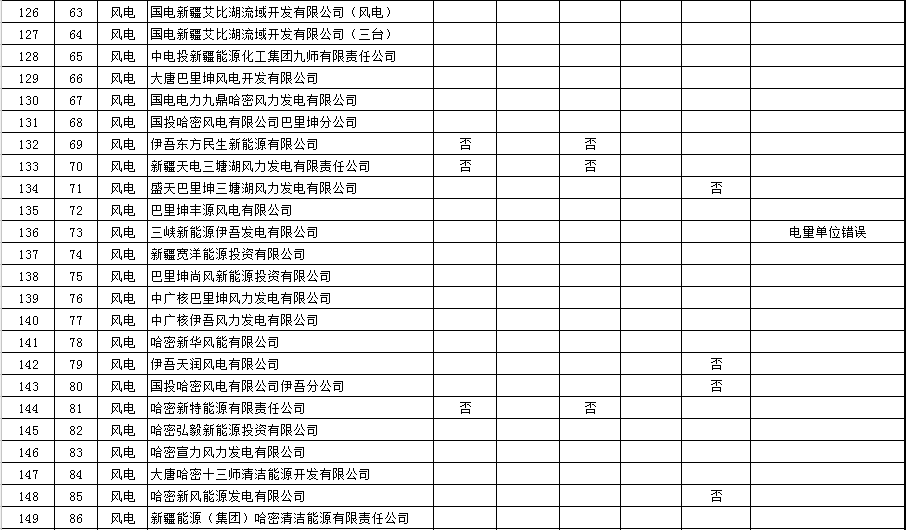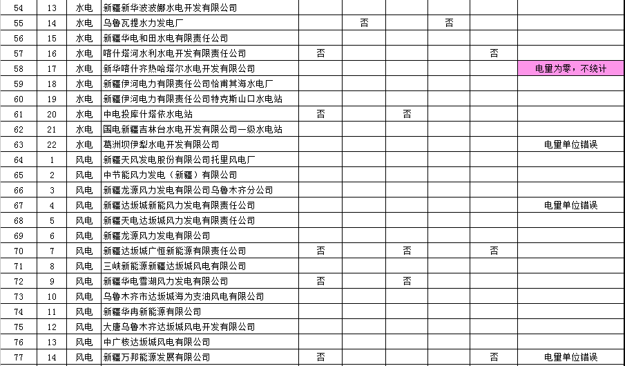 6、葛洲壩伊犁水電開發(fā)有限公司、新疆萬邦能源發(fā)展有限公司、新疆華瑞新能源有限公司等22家發(fā)電企業(yè)上報的數(shù)據(jù)有問題,其中15家上網(wǎng)電量大于或者等于發(fā)電量,7家電量單位錯誤,請下次注意。