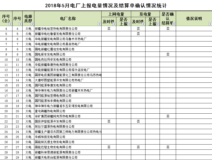 新疆2018年5月497家發(fā)電企業(yè)上報電量情況及結(jié)算單確認(rèn)情況的通報 (附詳單)