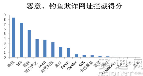 而在惡意網(wǎng)址識(shí)別上,國產(chǎn)殺軟依然凱歌高奏。騰訊和360分別以(8.42分)和(7.32分)占據(jù)前兩名,緊隨其后的是微軟(5.80分)。