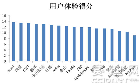 用戶體驗(yàn)板塊,來自捷克的avast出人意料的奪得第一(13.69分),緊隨其后的分別是來自中國的瑞星(13.52分)和斯洛伐克的ESET(13.37分)。
