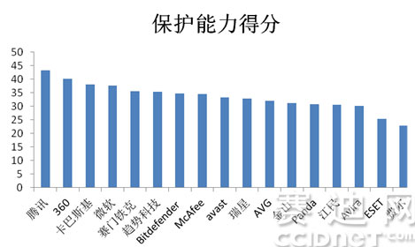 在保護(hù)能力板塊,騰訊(43.30分)和360(40.10分)、卡巴斯基(38.02分)勇奪前三。