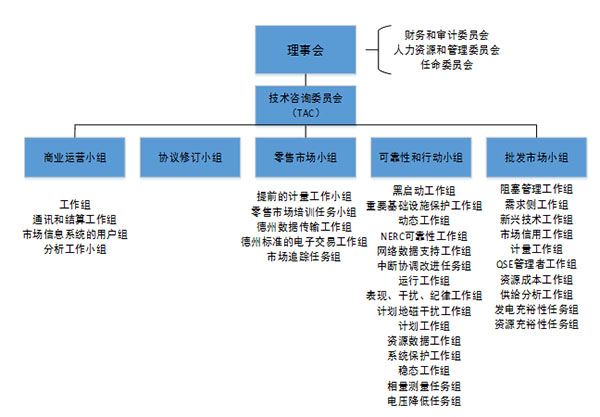 ERCOT是一個(gè)受德州公共事業(yè)委員會(huì)(Public Utility Commission of Texas,PUCT)和德州立法機(jī)構(gòu)監(jiān)管的非盈利企業(yè),由董事會(huì)直接管理,并采用會(huì)員制。董事會(huì)由獨(dú)立會(huì)員、消費(fèi)者以及ERCOT電力市場(chǎng)各部門代表組成。技術(shù)顧問委員會(huì)通過其五個(gè)附屬委員會(huì)以及多個(gè)任務(wù)小組和特別小組的協(xié)助為董事會(huì)提供政策建議。ERCOT的成員包括普通用戶、合作企業(yè)、發(fā)電企業(yè)、電力市場(chǎng)營銷人員、電力零售商、私有電力企業(yè)(輸配電供應(yīng)商)以及國有電力企業(yè)。