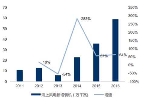 值得注意的是,與陸上風(fēng)電裝機(jī)下行相反,2016 年中國(guó)的海上風(fēng)電裝機(jī)則增長(zhǎng)了六成。2016 中國(guó)海上風(fēng)電新增裝機(jī) 154 臺(tái),容量達(dá)到 59 萬(wàn)千瓦,同比增長(zhǎng) 64%。
