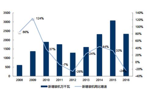 綜合國(guó)內(nèi)外的數(shù)據(jù)來(lái)看, 截至 2016 年,我國(guó)風(fēng)電新增裝機(jī)達(dá)約占全球風(fēng)電市場(chǎng)份額的42.7%,以絕對(duì)優(yōu)勢(shì)領(lǐng)跑全球風(fēng)電市場(chǎng)。而 2016 年國(guó)內(nèi)市場(chǎng)經(jīng)歷了風(fēng)電搶裝后的回調(diào), 同時(shí)疊加電力需求下降和電網(wǎng)消納風(fēng)電能力不足, 導(dǎo)致國(guó)內(nèi)市場(chǎng)的裝機(jī)容量明顯下滑,進(jìn)而全球市場(chǎng)風(fēng)電新增裝機(jī)容量隨之下滑。