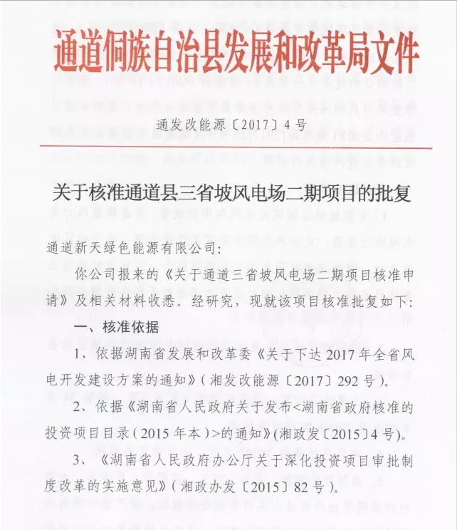 2017年7月13日,通道三省坡風(fēng)電場二期48MW工程順利獲得通道縣發(fā)改局核準(zhǔn)。
