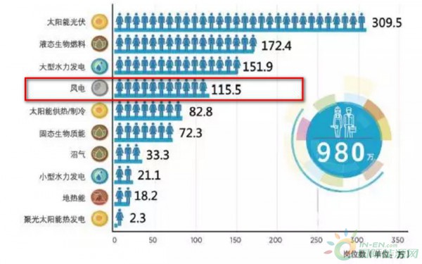 根據(jù)國際可再生能源署(IRENA)最近發(fā)布的數(shù)據(jù),2016年全球可再生能源行業(yè)的就業(yè)人數(shù)達(dá)到980萬人,風(fēng)能創(chuàng)造就業(yè)崗位較多的兩大技術(shù)分支之一。風(fēng)電從業(yè)者達(dá)到了115萬人。