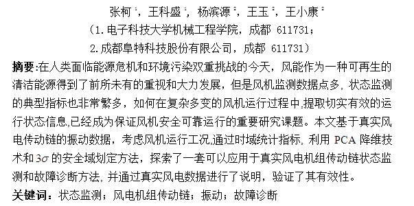 在已投產(chǎn)的風(fēng)電機(jī)組中,其傳動(dòng)鏈結(jié)構(gòu)比較復(fù)雜,一直是風(fēng)電機(jī)組故障的多發(fā)區(qū)。振動(dòng)信號作為傳動(dòng)鏈故障特征信息的載體,能夠有效地反映風(fēng)電機(jī)組傳動(dòng)鏈絕大部分的故障信息。但是, 目前風(fēng)電監(jiān)測的振動(dòng)數(shù)據(jù)動(dòng)輒十余處, 而且每處的振動(dòng)信號又可以進(jìn)行各種時(shí)域、頻域分析,運(yùn)行工況又復(fù)雜多變,造成故障決策過程頭緒繁多,很難給出有效的分析和明確的結(jié)論。為了解決這個(gè)問題,本文基于真實(shí)風(fēng)電傳動(dòng)鏈數(shù)據(jù),在提取多個(gè)時(shí)域指標(biāo)的基礎(chǔ)上,引入PCA(Principle Component Analysis)降維技術(shù),考慮運(yùn)行工況, 并劃定運(yùn)行安全閾值,通過2-3個(gè)融合指標(biāo)反映設(shè)備的運(yùn)行狀態(tài), 為進(jìn)一步實(shí)現(xiàn)傳動(dòng)鏈的運(yùn)維服務(wù)決策提供切實(shí)可行的數(shù)據(jù)分析方案。