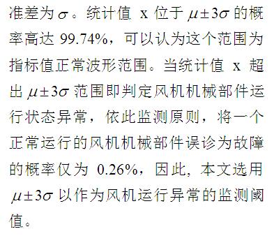 運(yùn)用統(tǒng)計(jì)指標(biāo)對風(fēng)機(jī)運(yùn)行狀態(tài)進(jìn)行監(jiān)測,必須為其正常狀態(tài)下振動(dòng)信號的統(tǒng)計(jì)指標(biāo)值確定一個(gè)變化范圍,當(dāng)統(tǒng)計(jì)值超出這個(gè)范圍時(shí),則判定風(fēng)機(jī)某機(jī)械部件運(yùn)行失常。對于一個(gè)連續(xù)測量,設(shè)備運(yùn)行狀態(tài)相對穩(wěn)定的數(shù)據(jù),可以看作近似服從正態(tài)分布。因此,完全可以認(rèn)為振動(dòng)數(shù)據(jù)的時(shí)域指標(biāo)值X服從正態(tài)分布: