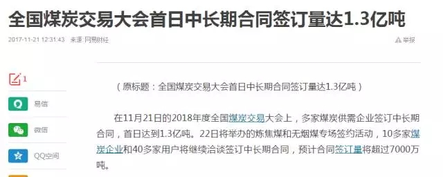 網(wǎng)易財(cái)經(jīng)也報(bào)道,今天中長(zhǎng)期合同簽訂量達(dá)到1.3億噸。22日將舉辦的煉焦煤和無(wú)煙煤專場(chǎng)簽約活動(dòng),10多家煤炭企業(yè)將和40多家用戶將繼續(xù)洽談簽訂中長(zhǎng)期合同,預(yù)計(jì)合同簽訂量將超過(guò)7000萬(wàn)噸。