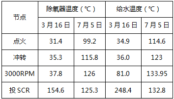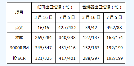 鍋爐點(diǎn)火后,保持再熱側(cè)煙氣擋板全開、過(guò)熱煙氣擋板全關(guān),在機(jī)組并網(wǎng)前始終保持此方式不變,通過(guò)減小省煤器、低溫過(guò)熱器受熱面吸熱量,增加低溫再熱器受熱面吸熱量,逐步提高脫硝入口煙氣溫度。下表-3為2017年3月16日、7月5日#2機(jī)組冷態(tài)啟動(dòng)低溫再熱器、省煤器出口煙溫對(duì)比分析。