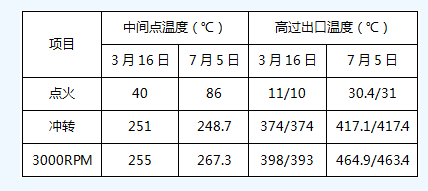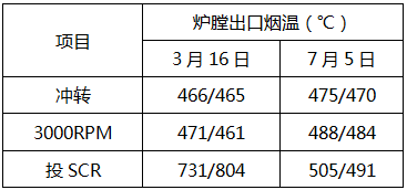 鍋爐點(diǎn)火至并網(wǎng)期間維持較小的鍋爐風(fēng)量,開機(jī)過(guò)程中始終維持約40%BMCR的鍋爐總風(fēng)量,通過(guò)關(guān)小各層燃燒器二次風(fēng)擋板及燃盡風(fēng)擋板,燃燒穩(wěn)定后逐步全開A層燃燒器二次風(fēng)擋板,抬高爐膛火焰中心。機(jī)組沖轉(zhuǎn)后、并網(wǎng)前,不退出一級(jí)大旁路系統(tǒng),進(jìn)一步增加燃料量,通過(guò)旁路來(lái)控制蒸汽參數(shù),從而進(jìn)一步提高了爐膛出口及SCR入口煙溫,但燃料的增加應(yīng)以主蒸汽溫升速率不超限、鍋爐不轉(zhuǎn)態(tài)為原則進(jìn)行控制。下表2為2017年3月16日、7月5日#2機(jī)組冷態(tài)啟動(dòng)爐膛出口煙溫對(duì)比分析。