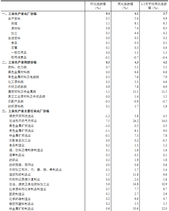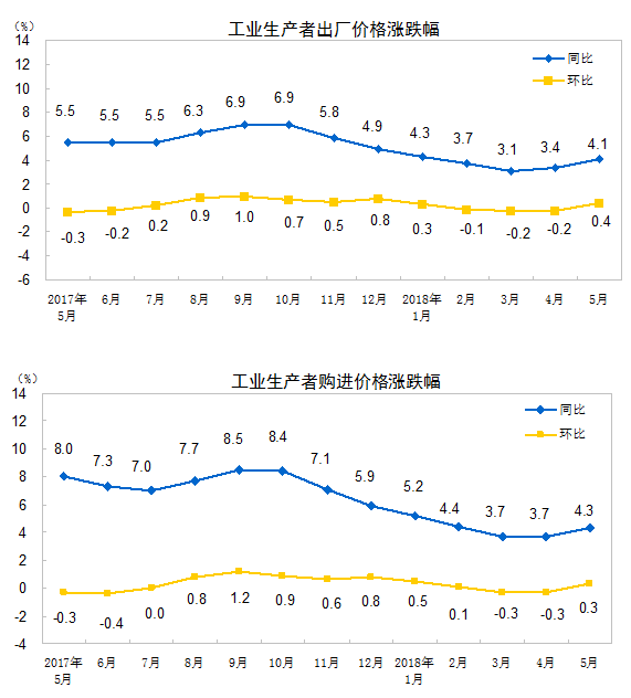 2018年5月份,全國工業(yè)生產(chǎn)者出廠價格同比上漲4.1%,環(huán)比上漲0.4%。工業(yè)生產(chǎn)者購進價格同比上漲4.3%,環(huán)比上漲0.3%。1-5月平均,工業(yè)生產(chǎn)者出廠價格比去年同期上漲3.7%,工業(yè)生產(chǎn)者購進價格上漲4.2%。