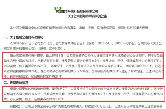 而凱迪生態(tài)面臨的訴訟情況也很驚人。截止到2018年6月7日,公司及全資子公司作為被告或被申請人涉及的訴訟合計138件。