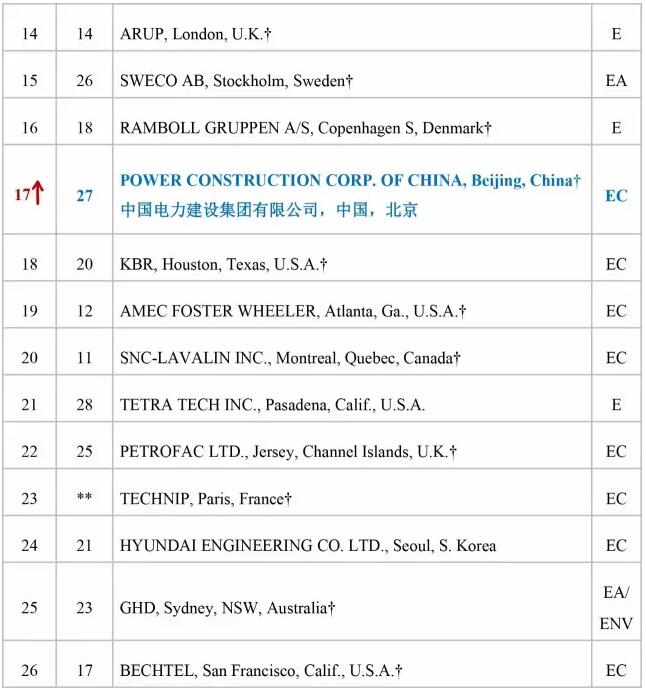 2015年,中國電建首次以“中國電力建設(shè)集團(tuán)有限公司”名義參與排名,就在ENR國際225強(qiáng)工程設(shè)計(jì)企業(yè)排名中位列第30位,并在上榜中資企業(yè)中排名第一。去年,中國電建位列榜單的第27位,前進(jìn)了3位,繼續(xù)領(lǐng)跑中企第一。今年,中國電建憑借不斷提升的經(jīng)濟(jì)指標(biāo)及國際影響力,超越自我,在排名中又前進(jìn)了10位,穩(wěn)坐中企頭把交椅!
