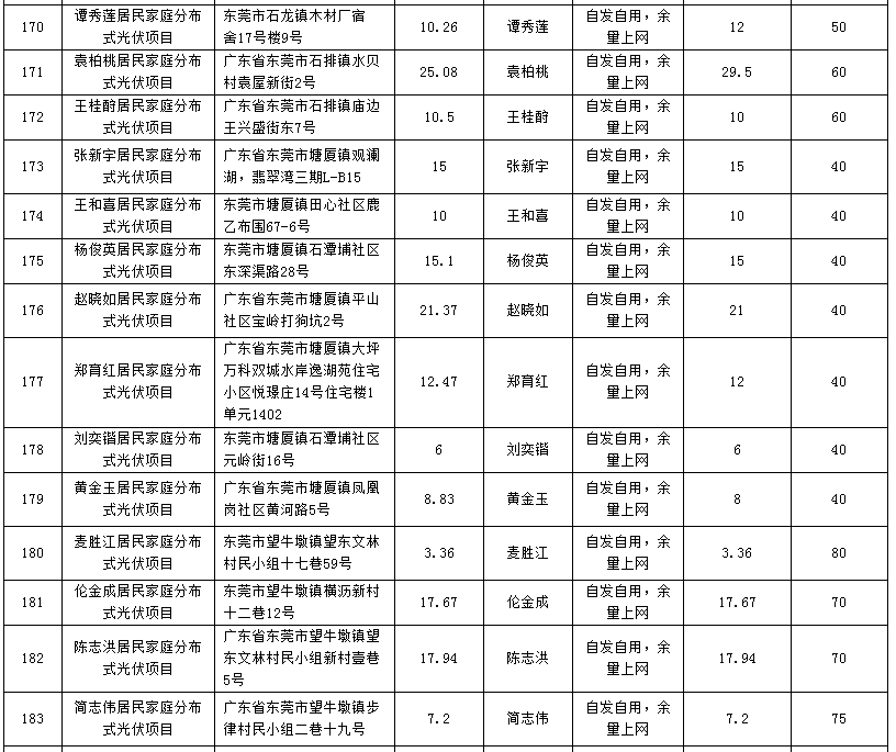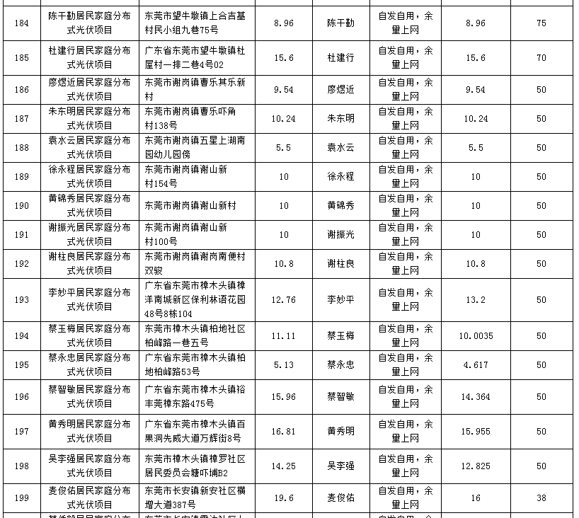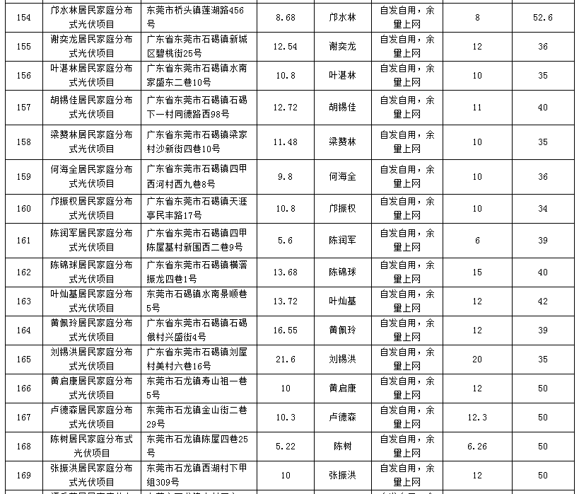 廣東東莞224個家庭分布式光伏項目備案信息表