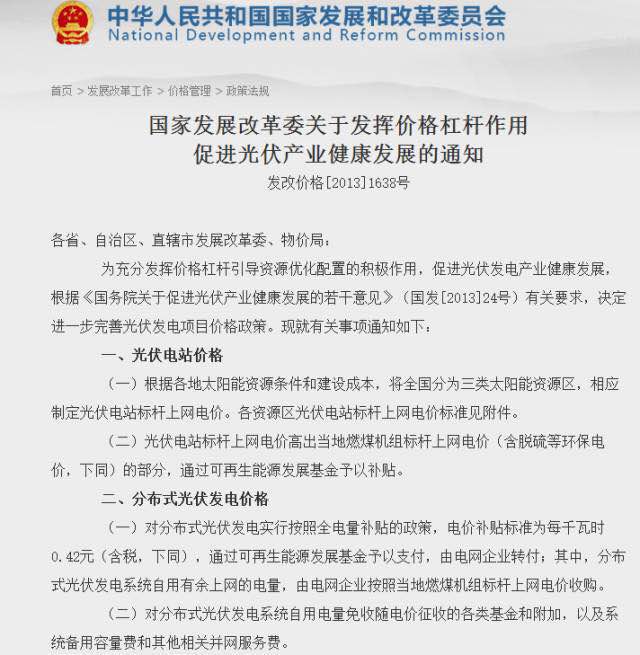2013年8月26日國家發(fā)改委發(fā)布的發(fā)改【2013】1638號文件。其中,文件明確提出,光伏發(fā)電項目自投入運營起執(zhí)行標桿上網電價或電價補貼標準,期限原則上為20年。