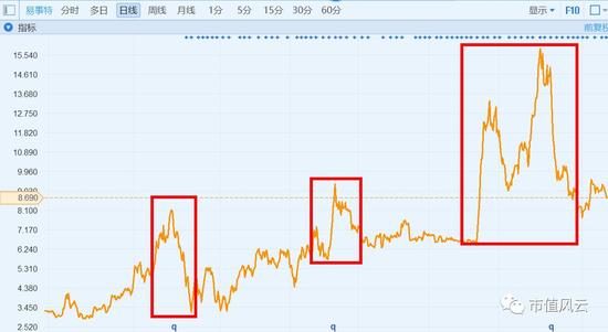在二級市場上,易事特的K線圖是這樣的,三個紅框處非常標準漂亮地復制了大幅上漲,快速下跌的行情,就像是一個模子里刻出來的。