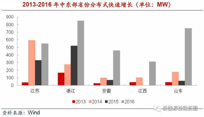 2017年上半年,我國分布式光伏新增裝機達到7.1GW,超過去年全年裝機(4.3GW)將近65%,其中山東、安徽、浙江三省分布式新增裝機3.9GW,占全國分布式電站新增裝機比重超過50%。