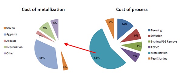(3)降低成本與節(jié)省用量勢在必行:正銀漿料雖然對于電池轉(zhuǎn)換效率具有重要的影響性,但是除了硅片以外,也是電池片生產(chǎn)所需最多的材料,超過了10%的成本比重。因?yàn)殡S著電池片的售價(jià)趨勢逐漸下滑,所以如何降低正銀的制造成本,或是配合網(wǎng)版或工藝技術(shù)節(jié)省生產(chǎn)的正銀用量,會(huì)是供應(yīng)商在材料研發(fā)上或是面對客戶要求時(shí)的必要條件之一。