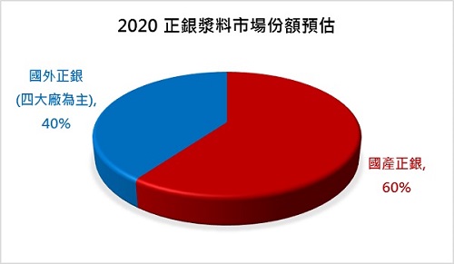 (1)國產(chǎn)正銀導(dǎo)電漿供應(yīng)商劇增:目前較知名的國產(chǎn)正銀供應(yīng)商,例如無錫帝科、蘇州晶銀、常州聚和、上??镉?、杭州正銀、深圳首騁、江蘇歐耐爾、浙江光達(dá)…等企業(yè),再加上正在投入開發(fā)的新興公司至少超過了20家以上,根據(jù)資料統(tǒng)計(jì)2016年國產(chǎn)正銀已達(dá)近20%的市場份額,預(yù)估在2017年國產(chǎn)正銀將會(huì)持續(xù)成長到30%,且往后每年會(huì)維持穩(wěn)定增加,預(yù)估2020年將有機(jī)會(huì)達(dá)到整體正銀市場的50-60%。