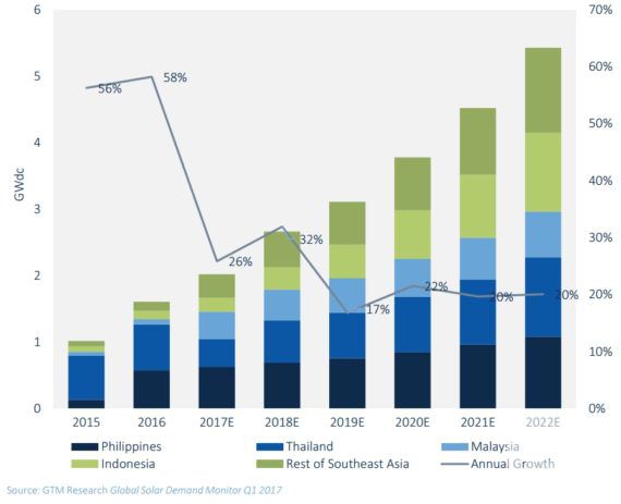 報(bào)告還強(qiáng)調(diào)泰國(guó)和馬來(lái)西亞等東南亞國(guó)家的潛在增長(zhǎng)機(jī)會(huì)。GTM預(yù)計(jì),由于慷慨和日益增加的清潔能源關(guān)稅,2017-2022年,泰國(guó)的新增太陽(yáng)能容量將超4.6吉瓦。