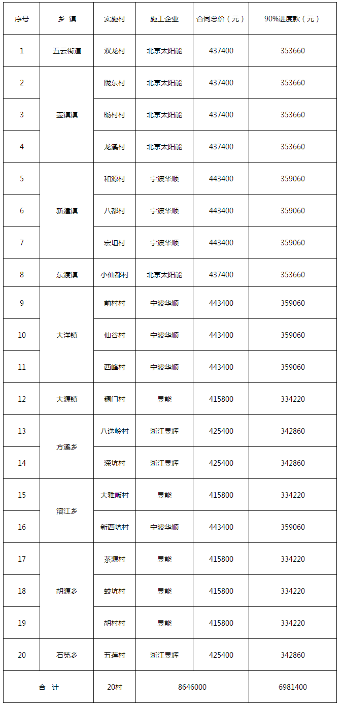 根據(jù)《關(guān)于下達(dá)光伏助村實(shí)施項(xiàng)目的通知》(縉農(nóng)〔2017〕5號(hào))精神,以及各鄉(xiāng)鎮(zhèn)與中標(biāo)施工作業(yè)單位簽訂的合同條款約定,目前止20個(gè)村項(xiàng)目主體工程已全部完成,現(xiàn)將擬撥付五云街道雙龍村等20個(gè)光伏助村項(xiàng)目進(jìn)度款進(jìn)