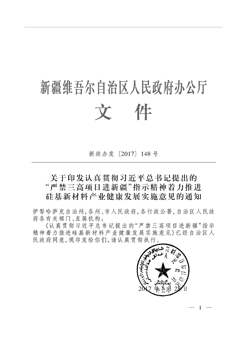 新疆印發(fā)“嚴(yán)禁三高項(xiàng)目進(jìn)新疆”指示精神 著力推進(jìn)硅基新材料產(chǎn)業(yè)健康發(fā)展實(shí)施