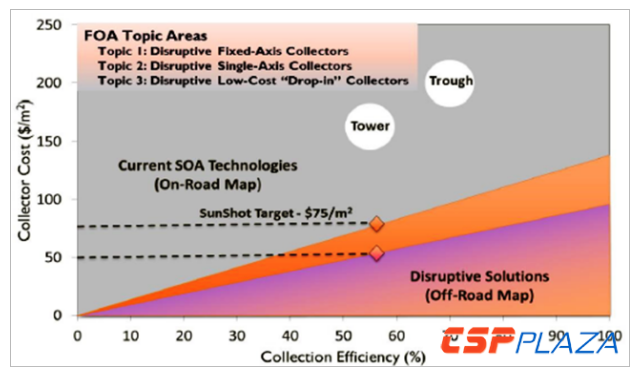 圖:SunShot計劃將槽式集熱器成本從約200美元/平方米降低到75美元/平方米。(數(shù)據(jù)來源:美國能源部)