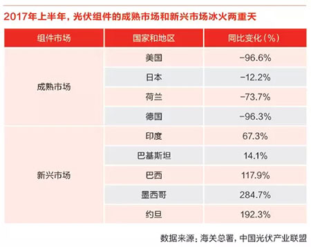 海外市場:兩處明顯變化值得注意。一是從總體上來看,無論是硅片、電池片還是組件,中國企業(yè)的出口量都維持著高速增長,然而其出口額卻明顯同比下降,這說明光伏組件的出口是在以量補(bǔ)價(jià),平均外銷價(jià)格要比去年低的多。二是從局部來看,國際市場結(jié)構(gòu)出現(xiàn)了明顯的變化,其中包括美國、德國、日本在內(nèi)的成熟市場出口額下滑明顯,而包括印度、巴西、墨西哥在內(nèi)的新興市場則出現(xiàn)了爆發(fā)式增長。這主要是由于中國企業(yè)已經(jīng)有不少在成熟市場國家投資建廠,出貨量不再走海關(guān)統(tǒng)計(jì)口徑的原因。