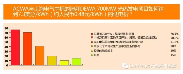 針對本次迪拜700MW光熱電站如何投出如此低的電價水平,CSP Focus對剛剛參與了CSP Focus光熱發(fā)電中東北非聚焦大會的代表進行了調研。綜合來看,如此低的中標價格得益于該項目的規(guī)模效應、較低的融資成本、中標方豐富的經(jīng)驗、電站成本的持續(xù)下降、生產(chǎn)本地化、中國元素的注入等因素。(詳見下圖)