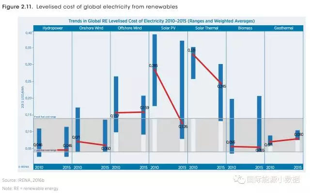根據(jù)國際可再生能源署的數(shù)據(jù),2010-2015年各類可再生能源全生命周期平準(zhǔn)成本(美元/千瓦時(shí))走向如下: