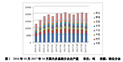 2017年9-10月份國(guó)內(nèi)多晶硅產(chǎn)量共計(jì)4.09萬(wàn)噸,同比增加57.9%,其中9月份產(chǎn)量2.07萬(wàn)噸,10月份2.02萬(wàn)噸,同比增幅分別為58.0%和57.8%。9-10月份產(chǎn)量同比大幅增加的主要原因是,去年同期國(guó)內(nèi)江蘇中能、新特能源、洛陽(yáng)中硅、新疆大全、亞洲硅業(yè)等一線大廠集中檢修,產(chǎn)出環(huán)比減少25.1%,故2017年9-10月份國(guó)內(nèi)多晶硅產(chǎn)量同比增幅較大。10月份產(chǎn)量環(huán)比小幅減少2.4%,雖然10月份新特、大全、神舟、國(guó)電四家企業(yè)檢修,影響部分供應(yīng),但到月底其中三家已恢復(fù)正常生產(chǎn),加之前期檢修結(jié)束后復(fù)產(chǎn)的企業(yè)產(chǎn)出量有一定程度增加,彌補(bǔ)一部分供應(yīng),故10月份國(guó)內(nèi)多晶硅產(chǎn)量較9月份減幅不大。9-10月份按產(chǎn)量排序,江蘇中能、新特能源、洛陽(yáng)中硅分別位居前三位,這三大企業(yè)產(chǎn)量占總產(chǎn)量的49.0%。前七家萬(wàn)噸級(jí)企業(yè):中能、特變、中硅、永祥、大全、亞硅、賽維產(chǎn)量共計(jì)2.98萬(wàn)噸,占國(guó)內(nèi)總產(chǎn)量的72.8%。